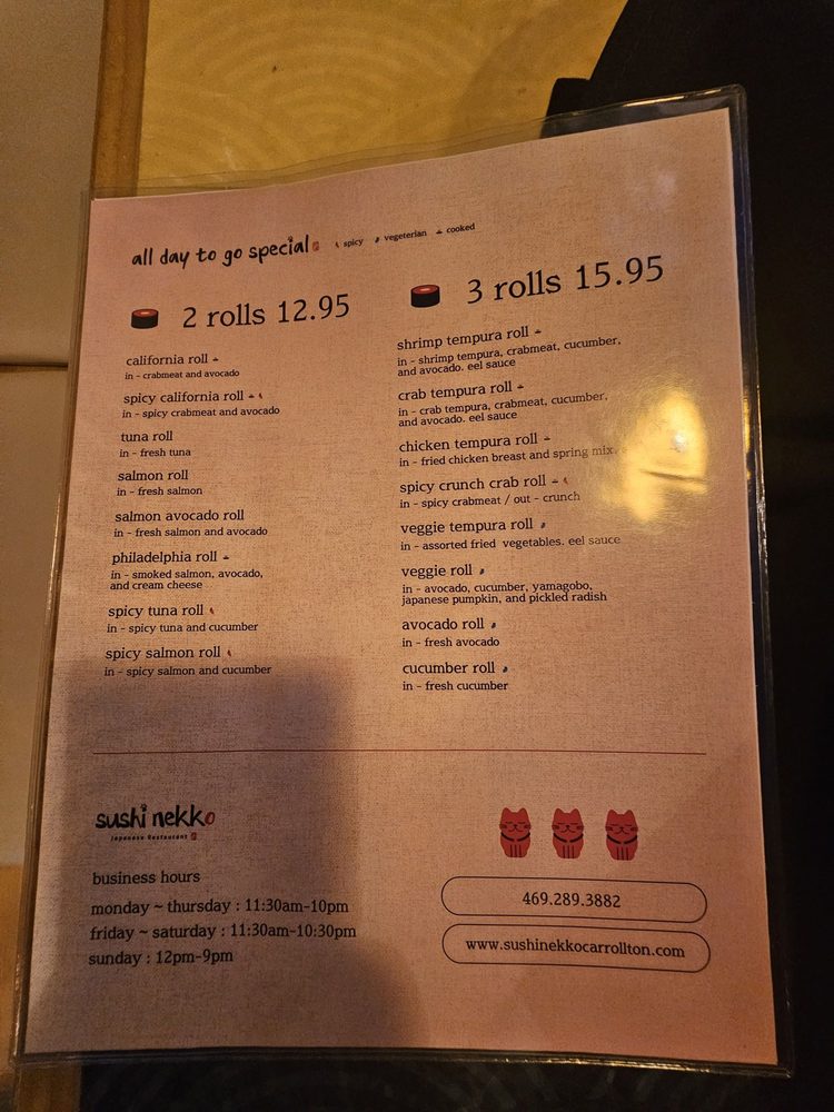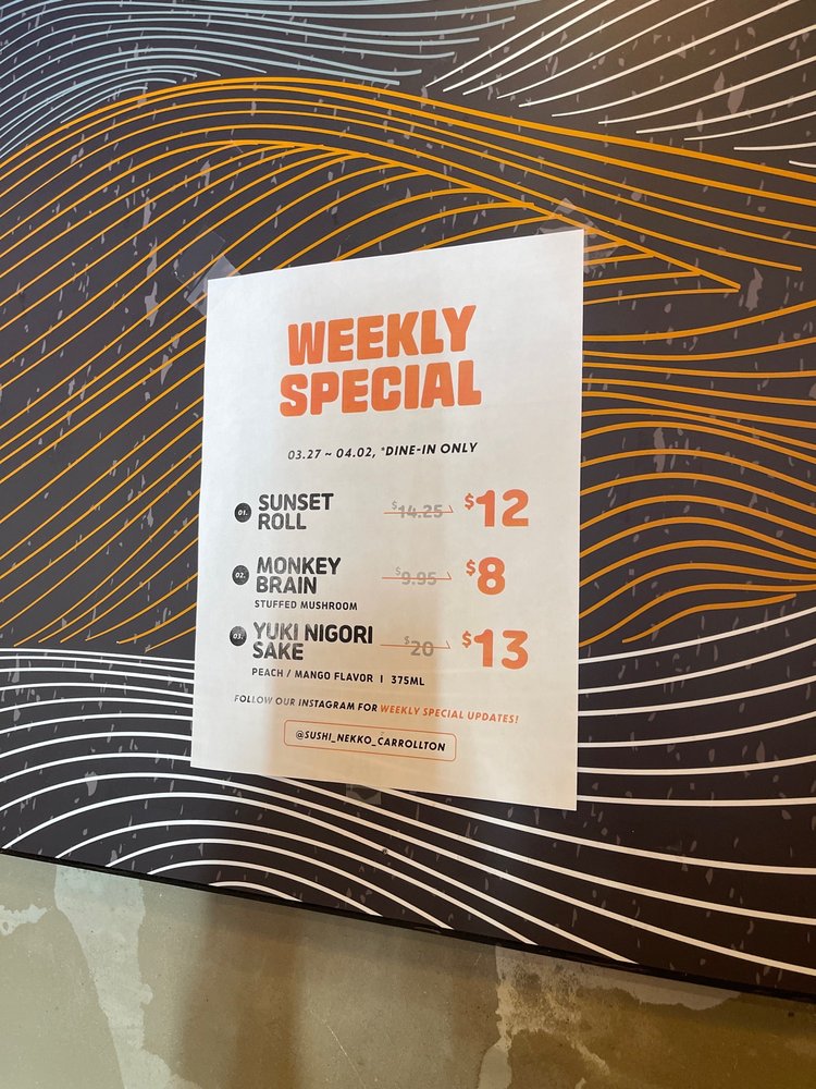 Located in Carrollton, TX, Sushi Nekko Japanese Restaurant offers a trendy and classy dining experience. Known for its exceptional sushi bar appetizers like the Ahi Tower and Peppered Tuna Tataki, this restaurant is a must-visit for sushi lovers. The Avocado Bomb and Bulgogi Fries from the kitchen appetizer menu are also crowd favorites. Don't miss out on the refreshing Sashimi Salad or the Seared Tuna Salad for a delightful burst of flavors. With options for takeout, delivery, and reservations, Sushi Nekko Japanese Restaurant is a convenient choice for any occasion. The casual dress code and friendly staff provide a welcoming atmosphere for guests. Experience the fusion of traditional Japanese flavors with a modern twist at Sushi Nekko - a true gem in the Carrollton dining scene.